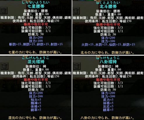 「七星腰帯」、「北斗腰帯」、「混元褶袴」、「八卦褶袴」がレアドロップで
