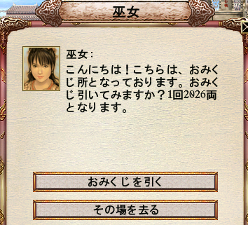 「巫女」からは様々な効果のある「おみくじ」が、一回2026両で引けます。
