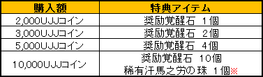 ※ 10,000UJJコインの特典アイテム「稀有汗馬之労の珠」の獲得は