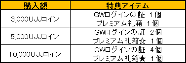 期間中、一度のお支払で3,000UJJコイン以上をご購入いただき、